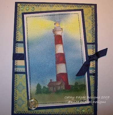 The dp is from the Ocean Glass paper pack, by K & Company, that I got a while back at Michaels. I sewed a zigzag stitch around the back layer and horizontal layer. The main image was stitched using a straight stitch. A navy blue ribbon , an antique button, and blue dew drops and my LightHouse card is finished.