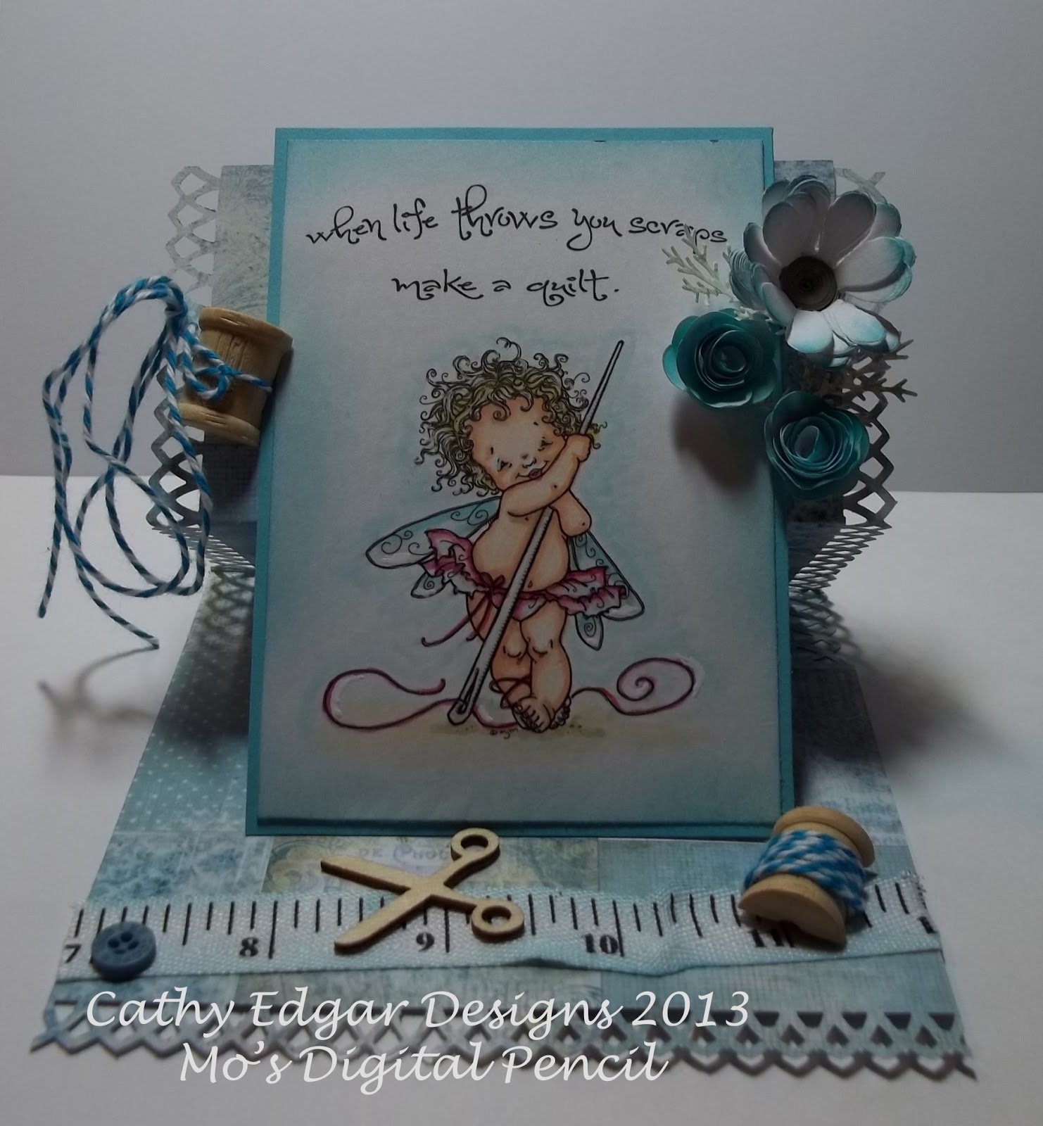 Have I mentioned I am in love with the little wooden die cuts right now, I had a pair of scissors that were perfect for my quilt card and a button finished off the embellishments set on the tape measure ribbon I found at Michaels. Three hand made flowers and my card is complete.